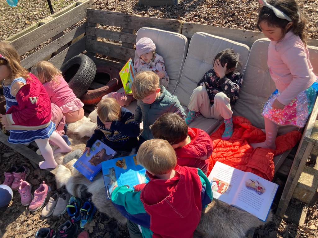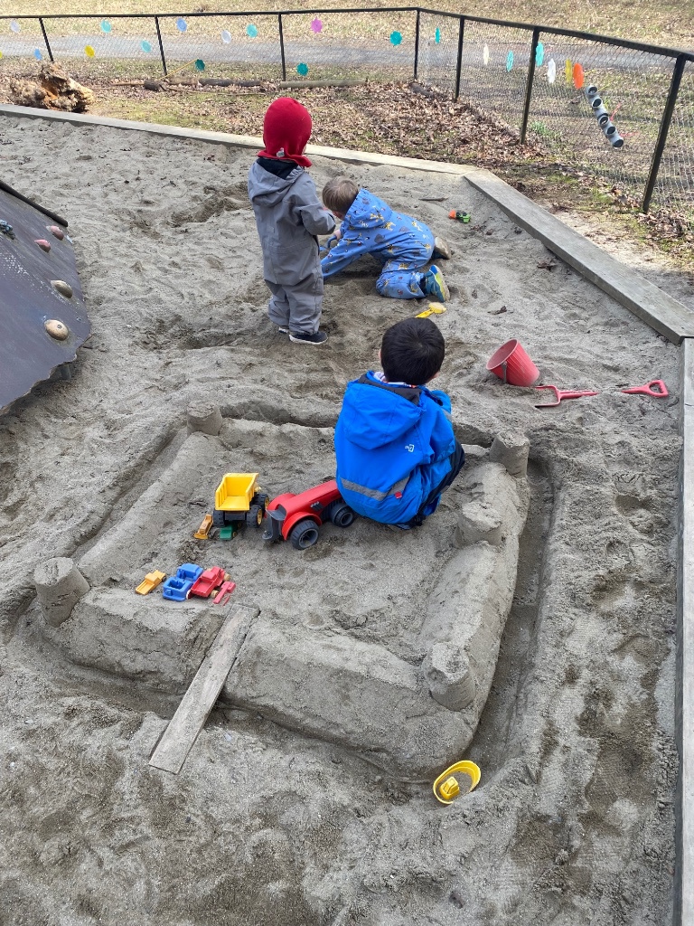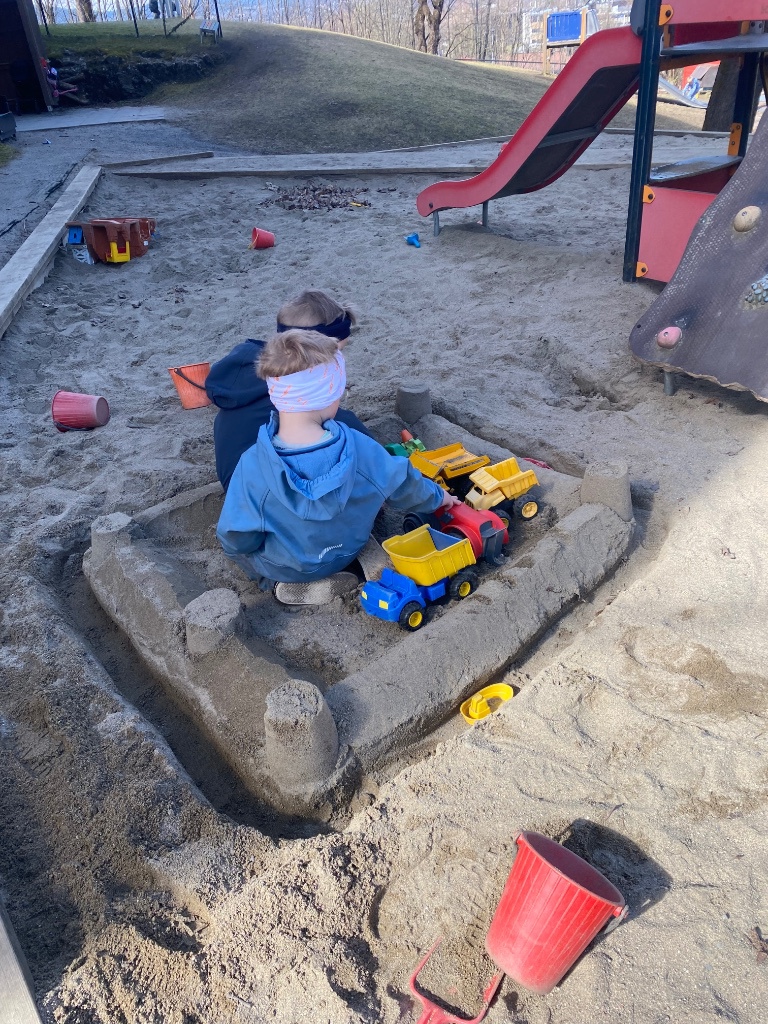 Kristine går søppel-plukke-tur med noen barn om gangen, vi sparker fotball, tar ut dukkevogner og stolputer til lesekroken vår ute.