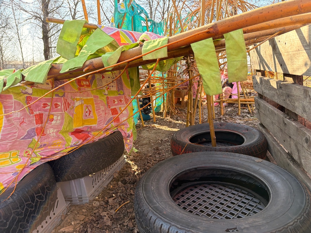 Pilehytten blir tidvis pimpet opp og pyntet med bøtter og spader. I dag var det nesten vindstille og såpass varmt i luften, at 3 barn fikk spise nisten sin i pilehytta. "Det var hyggelig!" - sitat barn, 6 år.